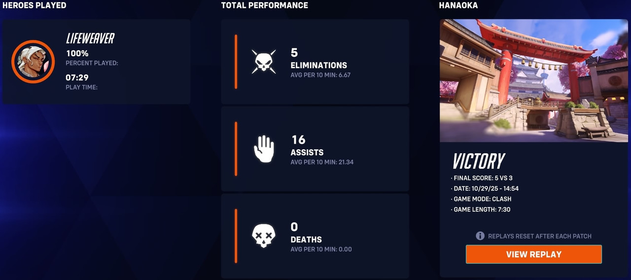 | Unranked quick play |  | Overwatch 2: Season 19 - Hanaoka (Unranked: Quick Play - Role Queue as Lifeweaver: October 29th - 2025) |  Illusionist | 0 | 18 | 12:38 31st Oct 2025 | |||||||||||||||||||||||||||||||||||||||||||||||||||||||||||||||||||||||||||||||||||||||||||||