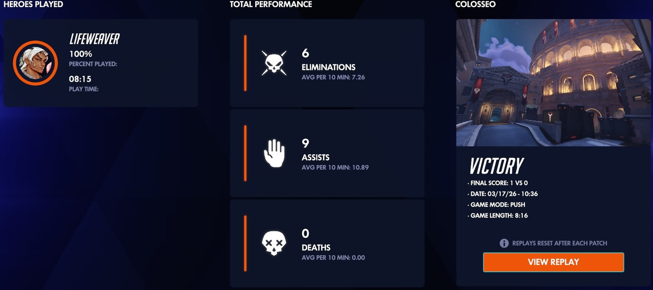 Unranked 6v6 quick play | ![]() | Overwatch: Season 1 - Colosseo (Unranked: 6v6 Quick Play - Open Queue as Lifeweaver: March 19th: 2026) | Illusionist | 0 | 16 | 03:35 21st Mar 2026 | |||||||||||||||||||||||||||||||||||||||||||||||||||||||||||||||||||||||||||||||||||||||||||||