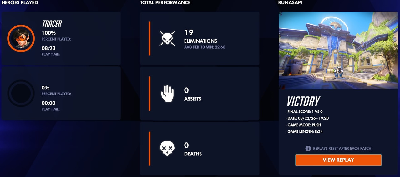 Details for replay Overwatch: Season 1 - Runasapi (Unranked: 6v6 Quick Play - Open Queue as Tracer: March 22nd - 2026)