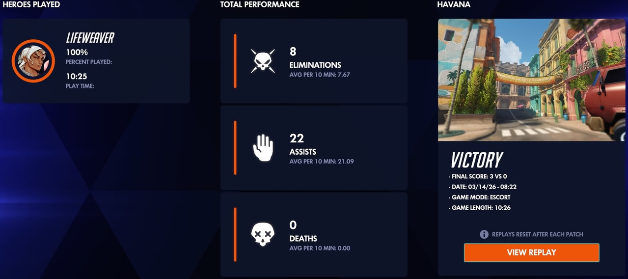 Details for replay Overwatch: Season 1 - Havana (Unranked: 6v6 Quick Play - Open Queue as Lifeweaver: March 14th - 2026)
