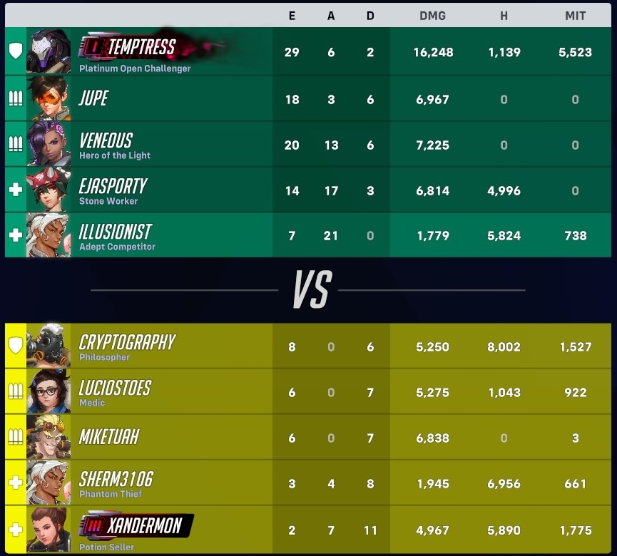 Mode: Unranked (Role Queue) Role: Support (Lifeweaver) Outcome: Win (2-0) Ally Team: Ramattra: E29-A6-D2⏐DMG16,248-H1,139-MIT5,523 Tracer: E18-A3-D6⏐DMG6,967-H0-MIT0 Sombra: E20-A13-D6⏐DMG7,225-H0-MIT0 Kiriko: E14-A17-D3⏐DMG6,814-H4,996-MIT0 Lifeweaver: E7-A21-D0⏐DMG1,779-H5,824-MIT738 VS. Roadhog: E8-A0-D6⏐DMG5,250-H8,002-MIT1,527 Mei: E6-A0-D7⏐DMG5,275-H1,043-MIT922 Junkrat: E6-A0-D7⏐DMG6,838-H0-MIT3 Lifeweaver: E3-A4-D8⏐DMG1,945-H6,956-MIT661 Brigitte: E2-A7-D11⏐DMG4,967-H5,890-MIT1,775 Verification of Scorecard: https://i.postimg.cc/1zRM7ZDb/OW2-Scorecard.jpg Verification of Stats: https://i.postimg.cc/BnSx4BtW/OW2-Stats.jpg Verification of Performance: https://i.postimg.cc/9XPR0w6h/OW2-Performance.jpg