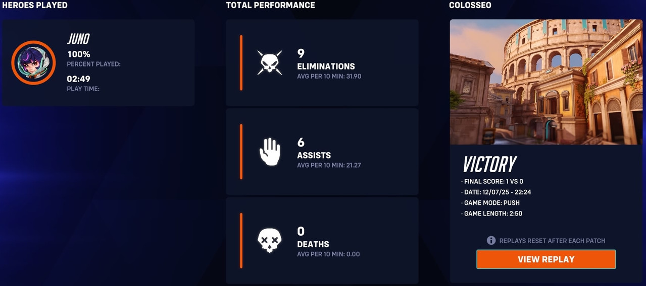 Unranked quick play | ![]() | Overwatch 2: Season 19 - Colosseo (Unranked: Quick Play - Role Queue as Juno: December 7th - 2025) | Illusionist | 0 | 16 | 02:24 9th Dec 2025 | |||||||||||||||||||||||||||||||||||||||||||||||||||||||||||||||||||||||||||||||||||||||||||||