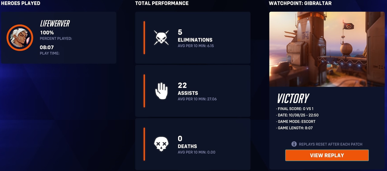 Details for replay Overwatch 2: Season 18 - Watchpoint: Gibraltar (Unranked: Role Queue - October 8th, 2025)