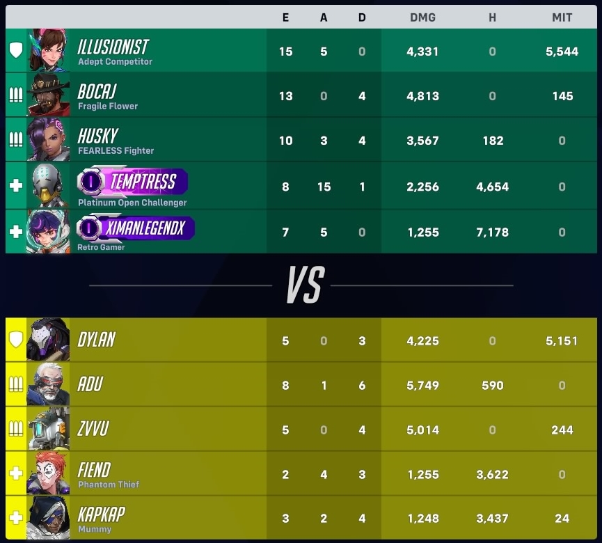 Mode: Unranked (Role Queue) Role: Tank (D.Va) Outcome: Win (3-0) Ally Team: D.Va: E15-A5-D0⏐DMG4,331-H0-MIT5,544 Cassidy: E13-A0-D4⏐DMG4,813-H0-MIT145 Sombra: E10-A3-D4⏐DMG3,567-H182-MIT0 Zenyatta: E8-A15-D1⏐DMG2,256-H4,654-MIT0 Juno: E7-A5-D0⏐DMG1,255-H7,178-MIT0 VS. Enemy Team: Ramattra: E5-A0-D3⏐DMG4,225-H0-MIT5,151 Soldier: 76: E8-A1-D6⏐DMG5,749-H590-MIT0 Bastion: E5-A0-D4⏐DMG5,014-H0-MIT244 Moira: E2-A4-D3⏐DMG1,255-H3,622-MIT0 Ana: E3-A2-D4⏐DMG1,248-H3,437-MIT24 Verification of Scorecard: https://i.postimg.cc/VNV7GHbs/OW2-Scorecard.jpg Verification of Stats: https://i.postimg.cc/B6hmyS7n/OW2-Stats.jpg Verification of Performance: https://i.postimg.cc/T3CQhYGJ/OW2-Performance.jpg