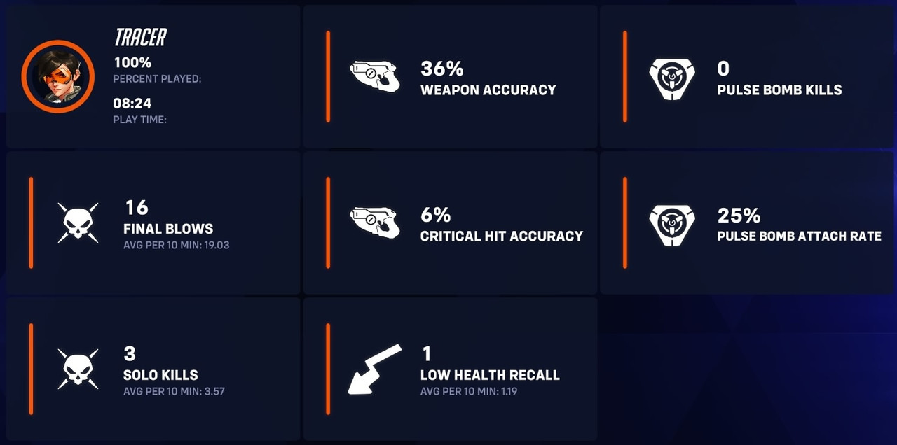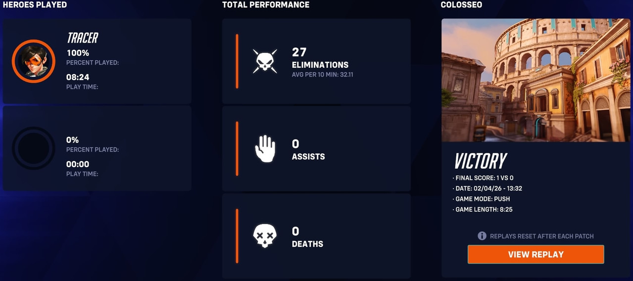 Unranked 6v6 quick play | ![]() | Overwatch 2: Season 20 - Colosseo (Unranked: 6v6 Quick Play - Open Queue as Tracer: February 4th - 2026) | Illusionist | 100%(1) | 0 | 12 | 05:01 8th Feb 2026 | ||||||||||||||||||||||||||||||||||||||||||||||||||||||||||||||||||||||||||||||||||||||||||||